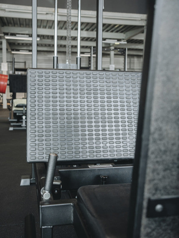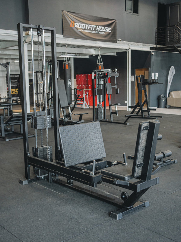 Trabajo de los músculos de la parte inferior del cuerpo en posición sentada: el trabajo se realiza empujando las piernas sobre la plataforma y se dirige principalmente a los cuádriceps y los glúteos, con cierta participación de los isquiotibiales y las pantorrillas.